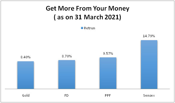 As the chart below illustrates, the long-term growth of stocks are historically been greater than that Gold, Fix deposit (FD), Public Provident Fund (PPF).